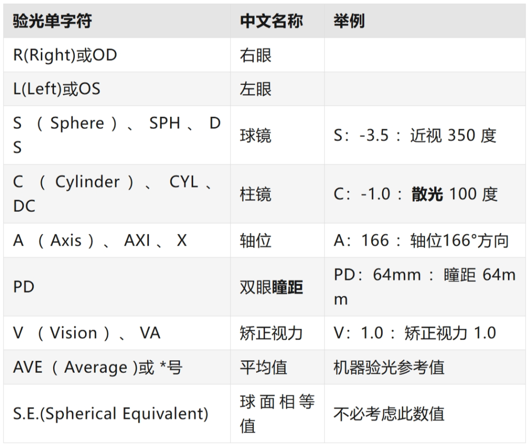 首先来讲解一下验光单上的各种标识字符都代表什么意思: