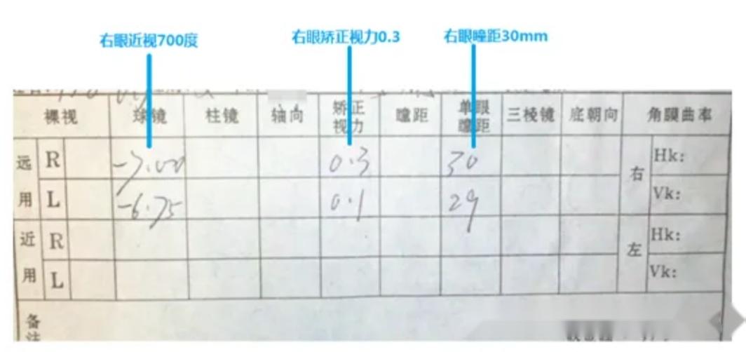 右眼:近视700度,无散光;瞳距30mm,矫正视力为0.3